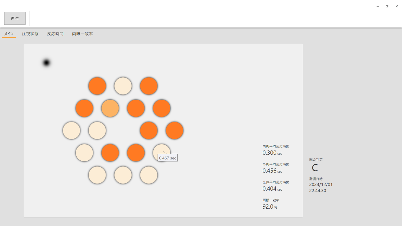 EYESCOREは視野周辺の変化に気づく速さである「反応速度」の計測が可能です。これはビジョントレーニングの評価や運動能力の評価に活用できます。例えば、野球選手のバッティングにおける変化球への対応率と、「反応速度」のスコアを結びつけることで、選手にとってそのトレーニングが有効かどうかを評価することもできます。反応速度は画面に表示されるナビゲーションに従い、「点」が表示された際、その点を見ることで計測可能です。